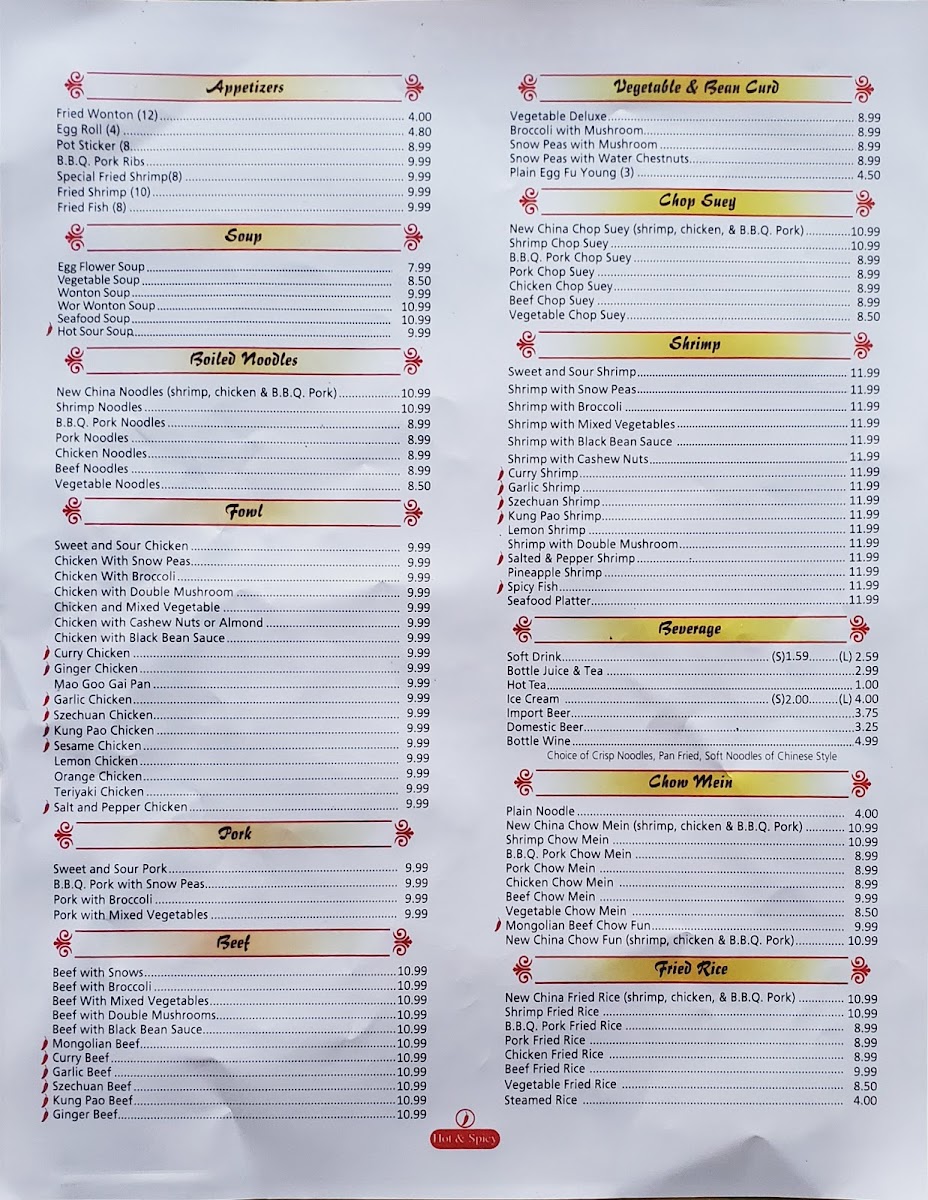 New China Restaurant offers a menu that balances classic Chinese favorites with the casual appeal of a buffet setting. The selection invites diners to enjoy familiar dishes like crispy egg rolls, savory B.B.Q. pork ribs, and a variety of seafood options, all available in generous portions to share or savor alone.